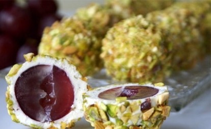 Замесить творожный сыр, смешать его с плавленым сыром. Фисташковая отбивная. Делаем лепешку из сыра, в середину кладем виноград и формируем шар. Шарики катятся в толченых фисташках. Перед подачей шарики хранят в холодильнике.