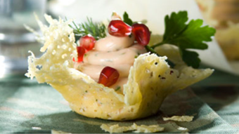 Приготовьте сырную корзину. Для этого сыр натереть на терке, 2-3 ст. л.сира выложить тонким слоем в виде кружочка на противень, застеленный бумагой для выпечки. Запекать в духовке и запекать, пока сыр не растает. Быстро выложите мягкий сыр на перевернутый стакан и дайте ему застыть.